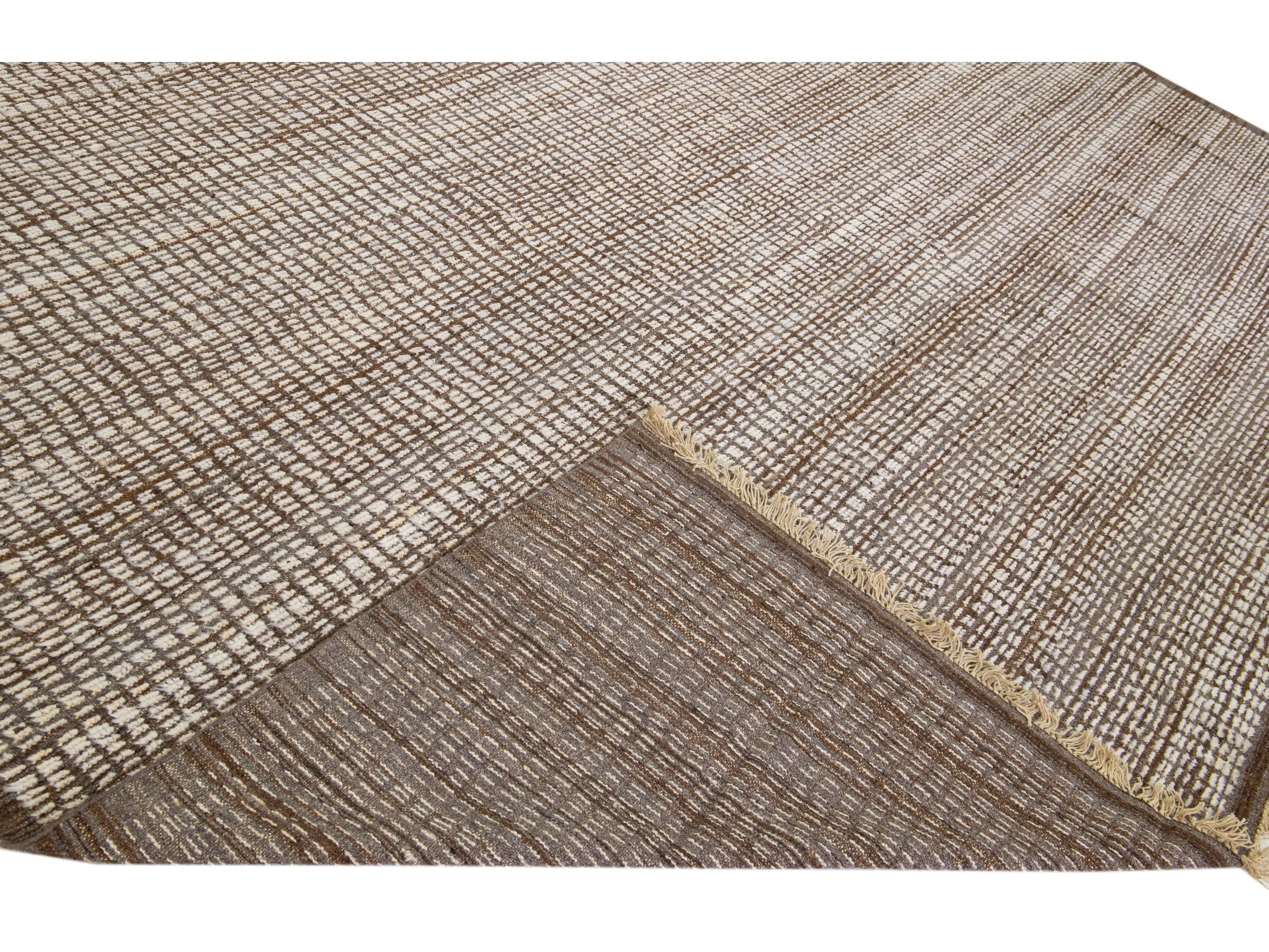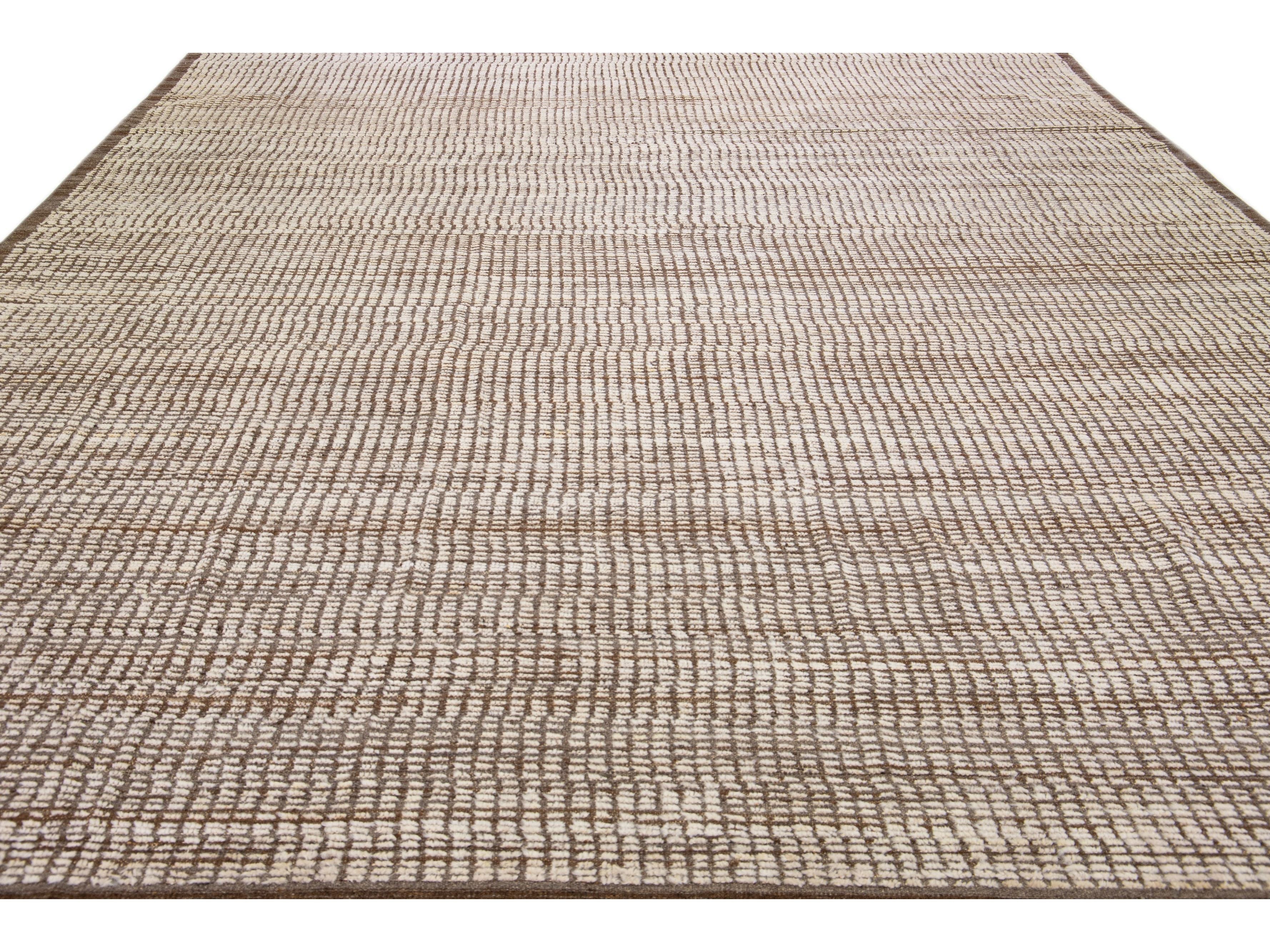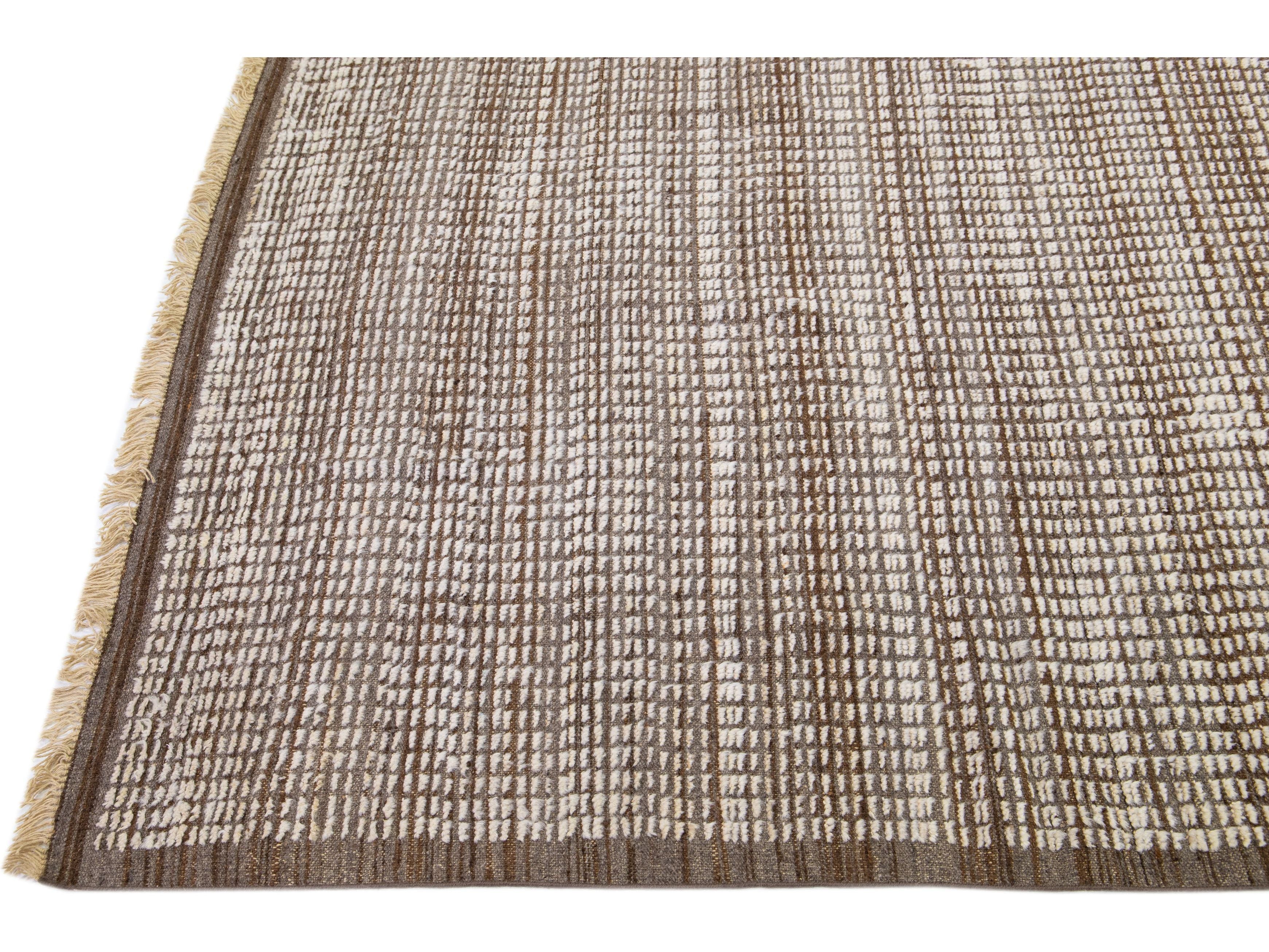 Beautiful modern Moroccan style hand-knotted wool rug with a brown field. This piece has a gorgeous subtle geometric pattern design.