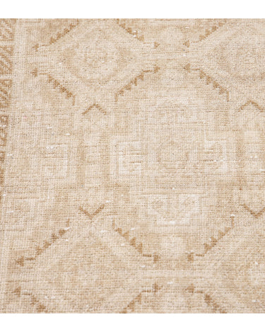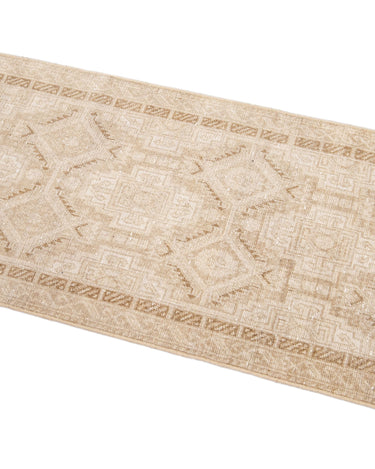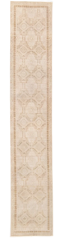 Beautiful antique Turkish Sivas runner rug with a beige field. This piece has an ivory accent in an all-over Tribal design.