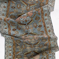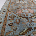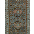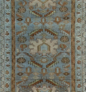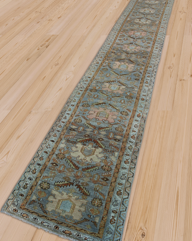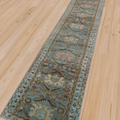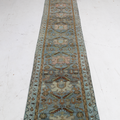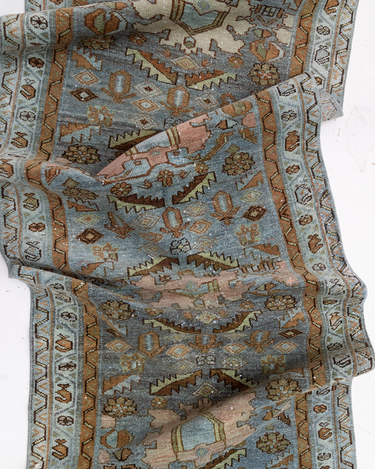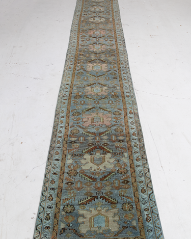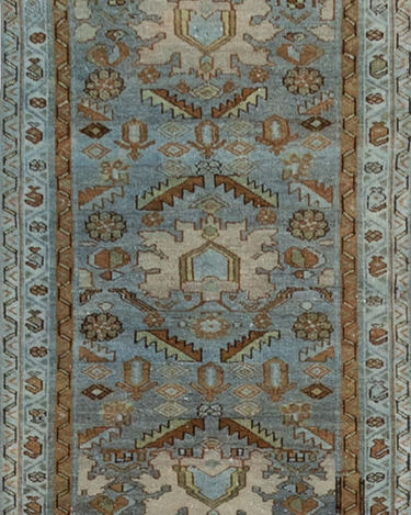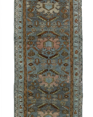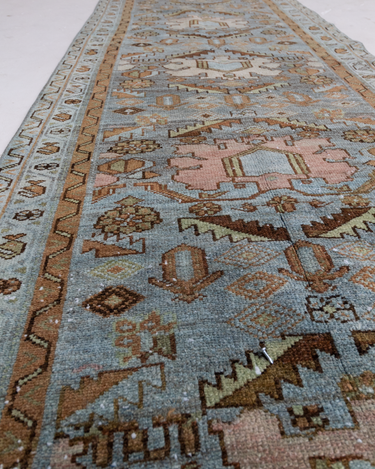 Beautiful vintage Oriental Hamadan with a nice soft pile in a misty blue tone. Soft pink accents. Harmonious with large scale blossoming seed symbols. Unique is size and an excellent option for a narrow hallway that needs a show stopper. Great condition.