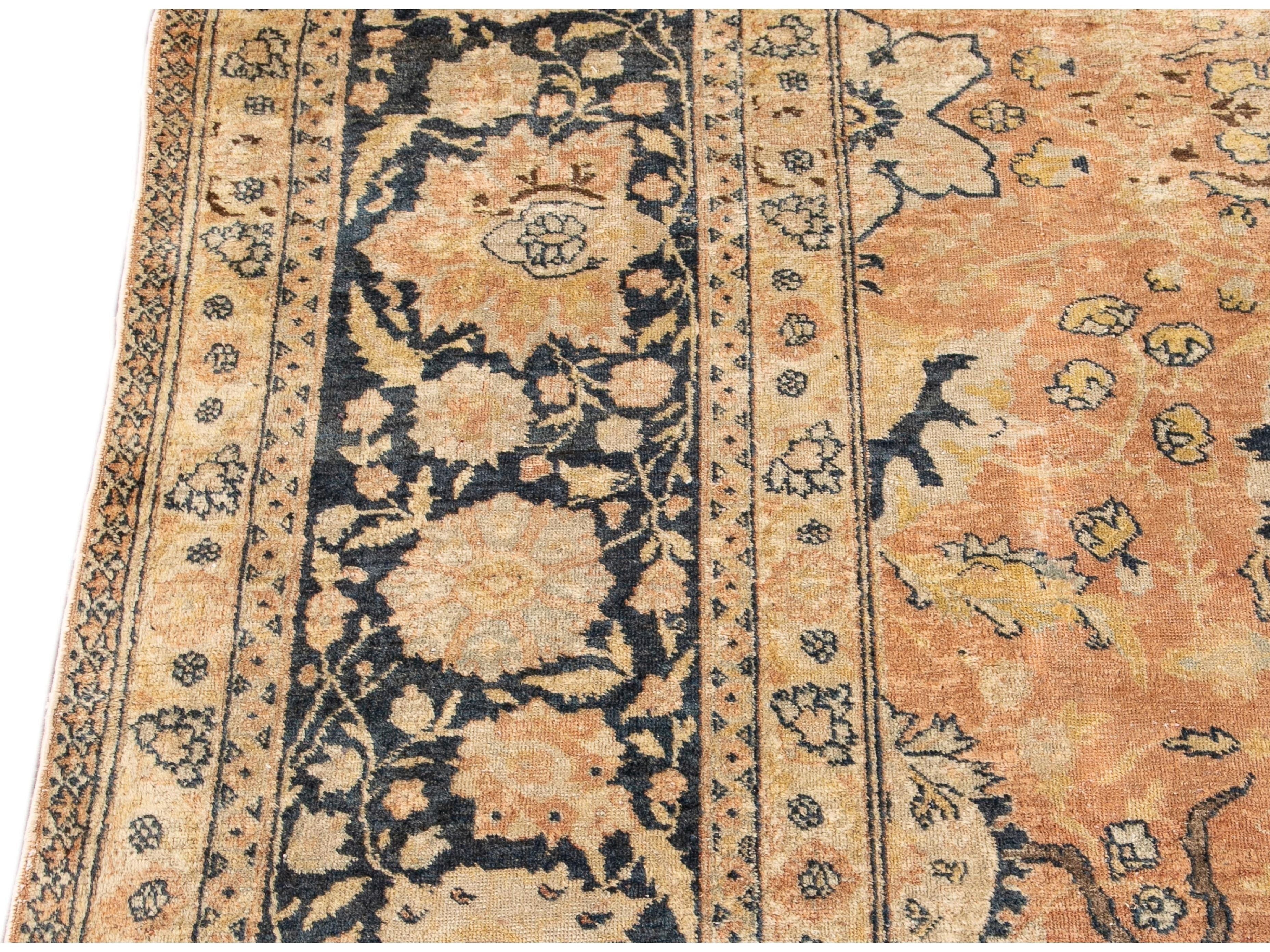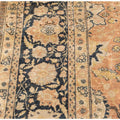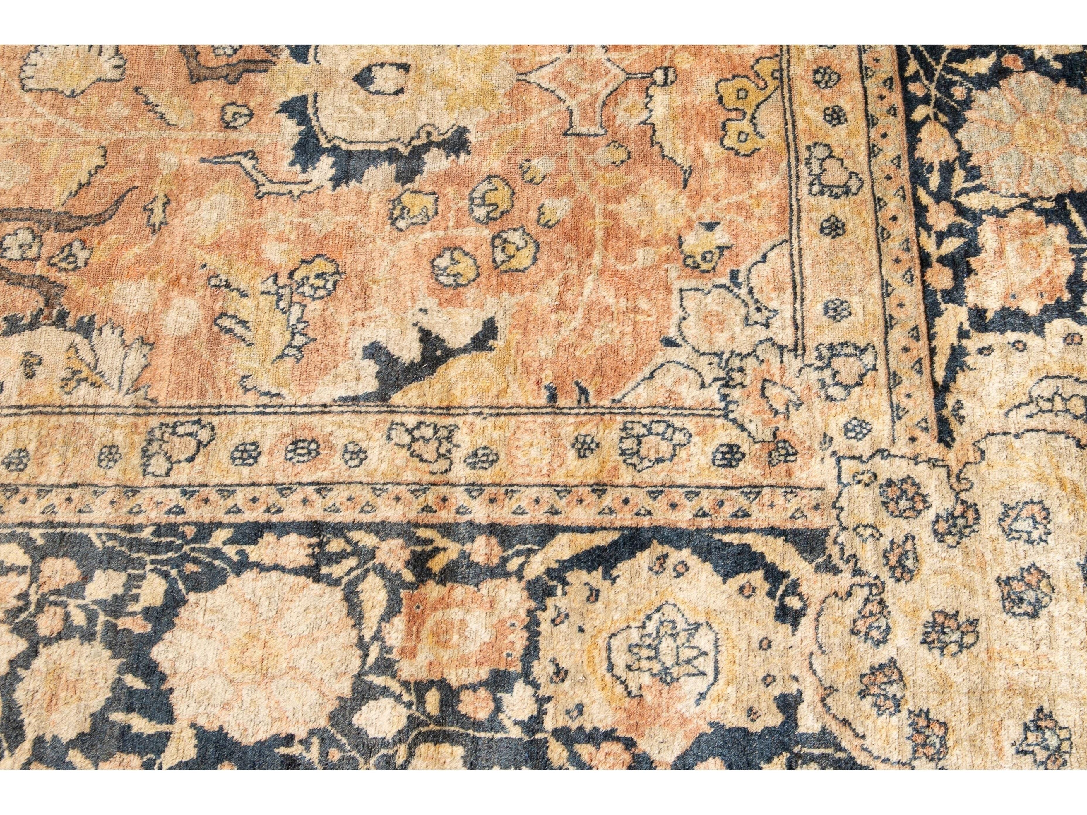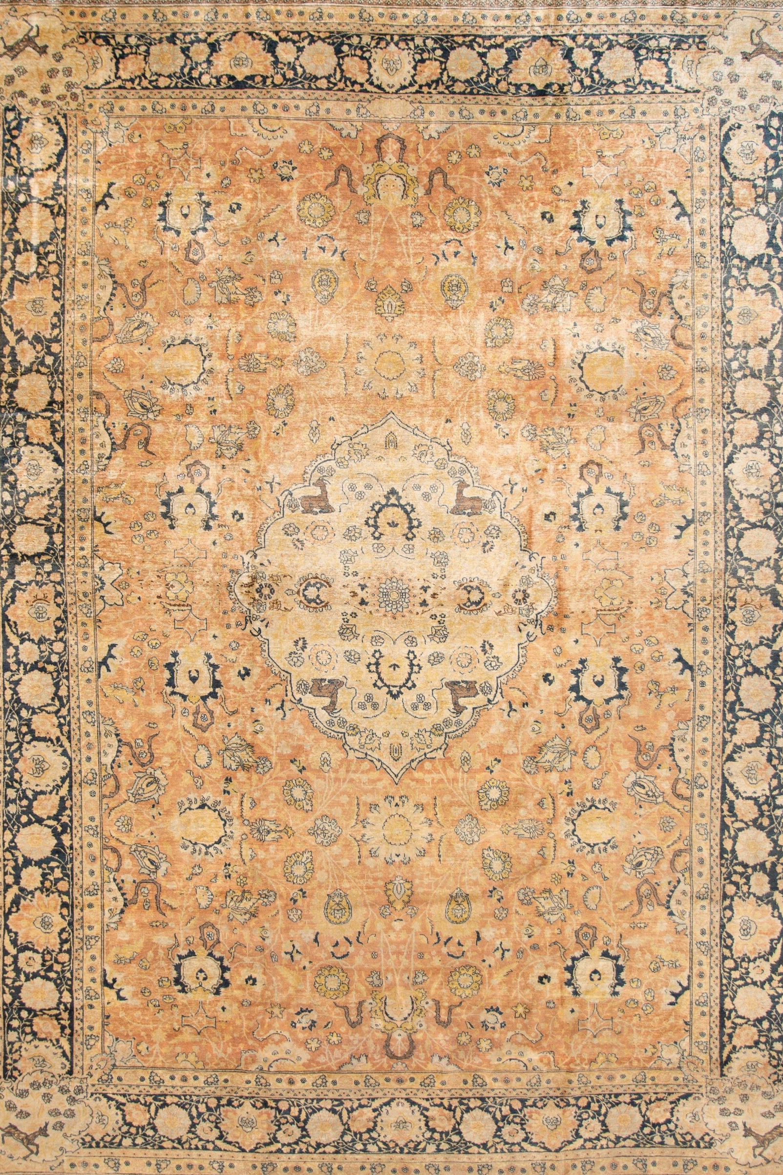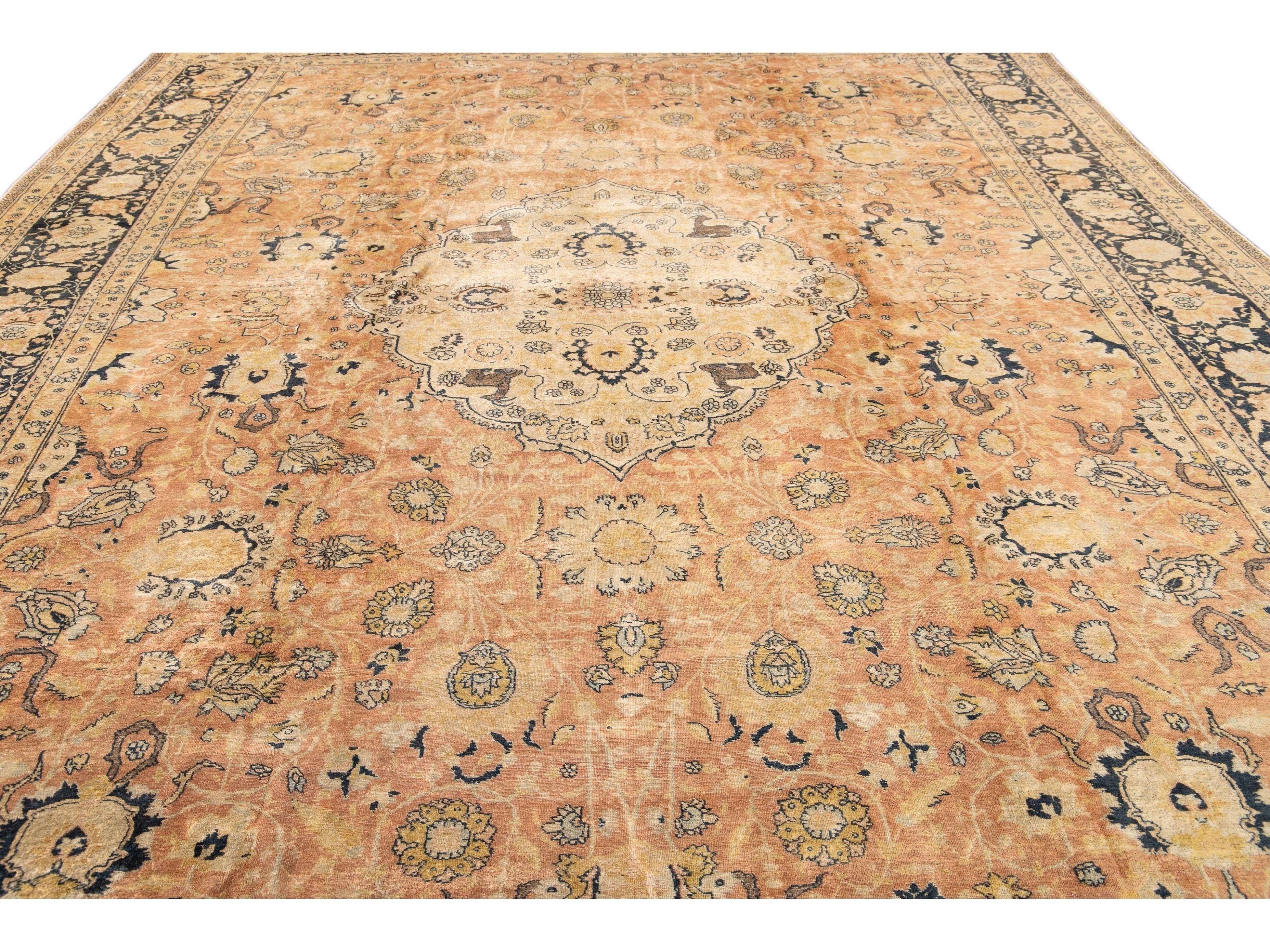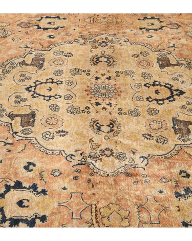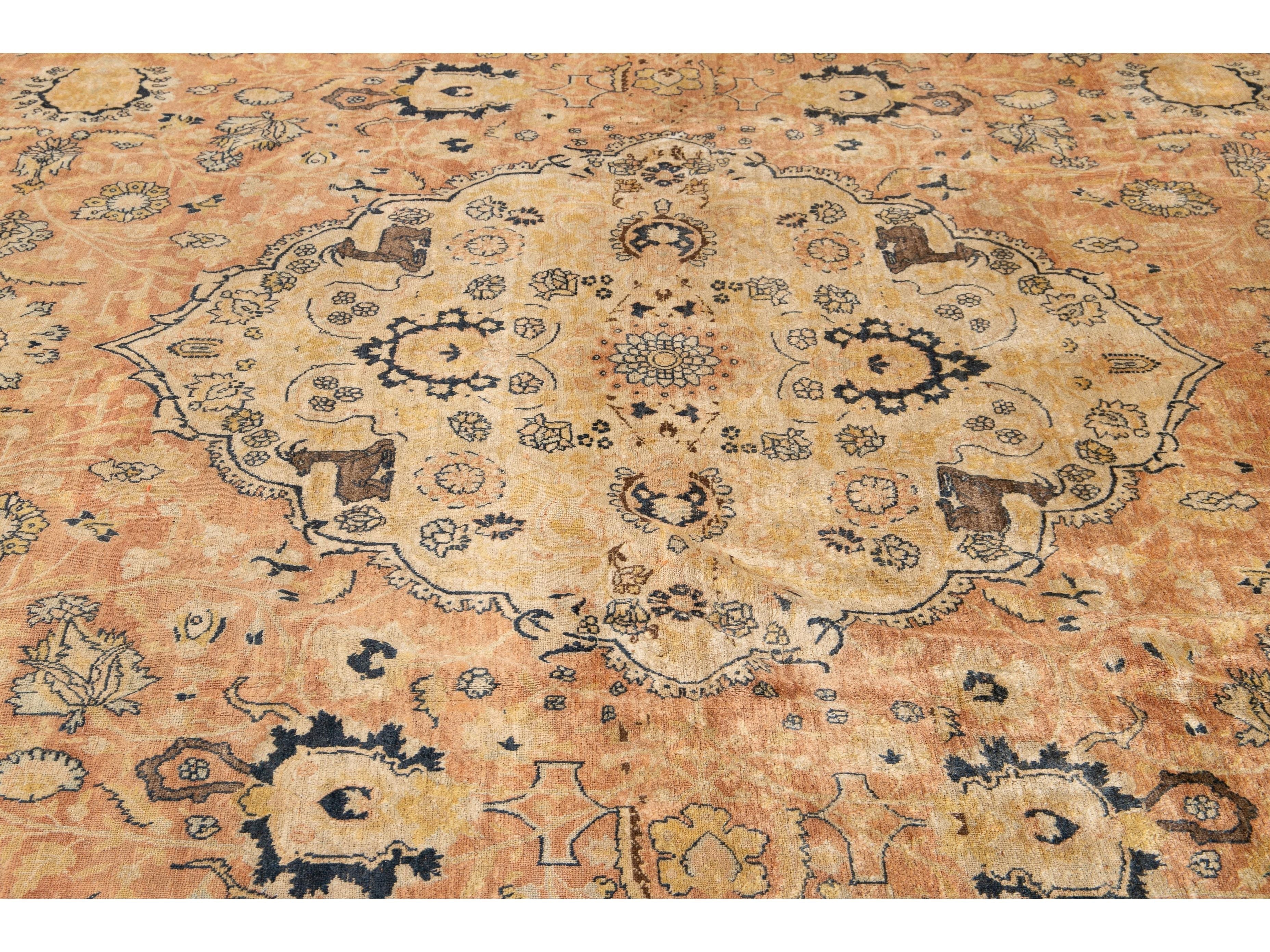 Beautiful antique Agra hand-knotted wool rug with a medallion floral design on a peach field. This Indian rug has accents of brown, blue, and yellow throughout the piece.