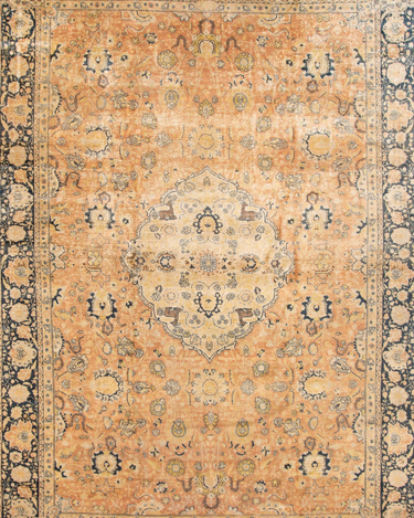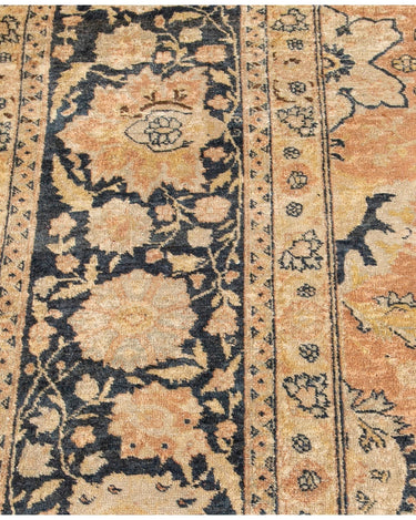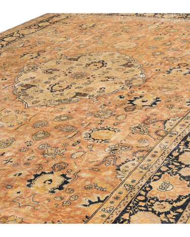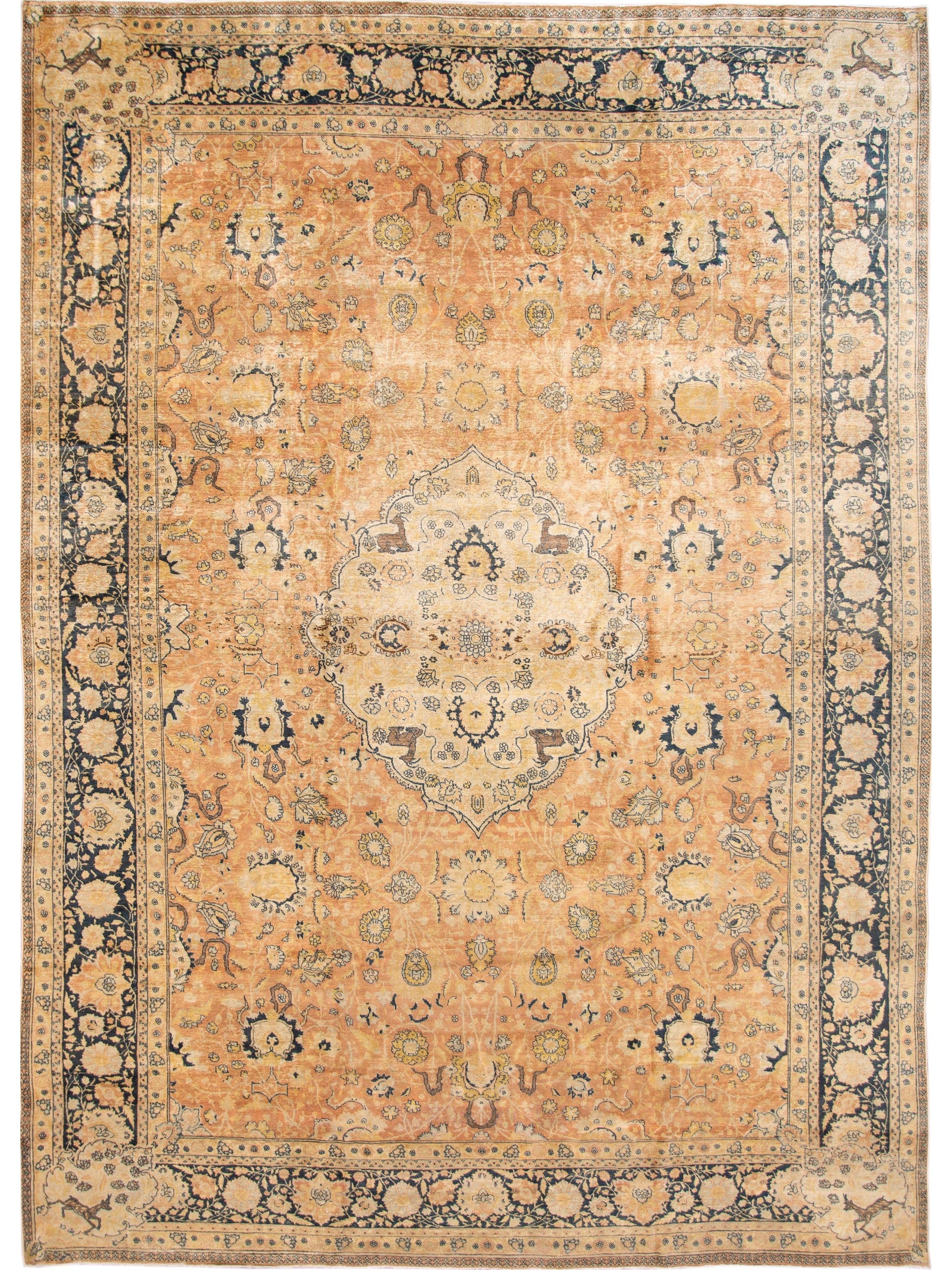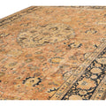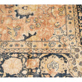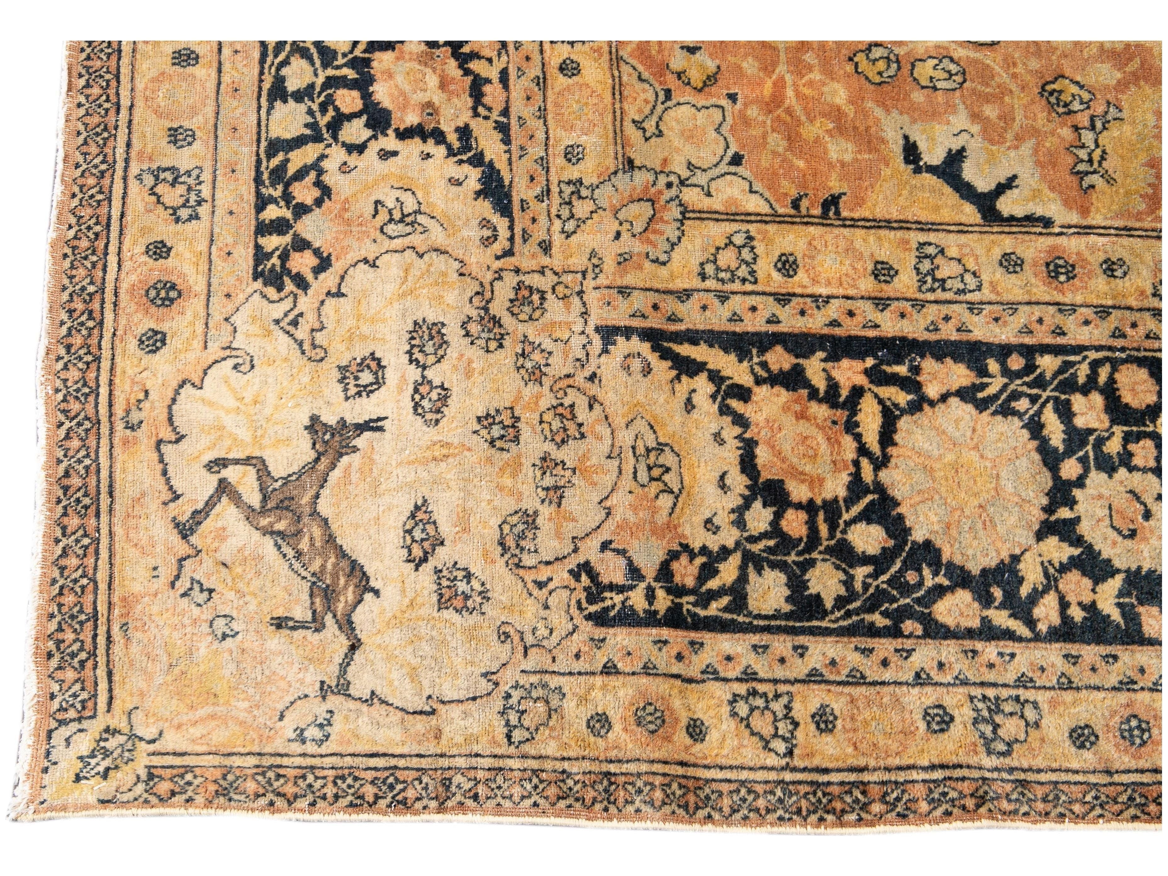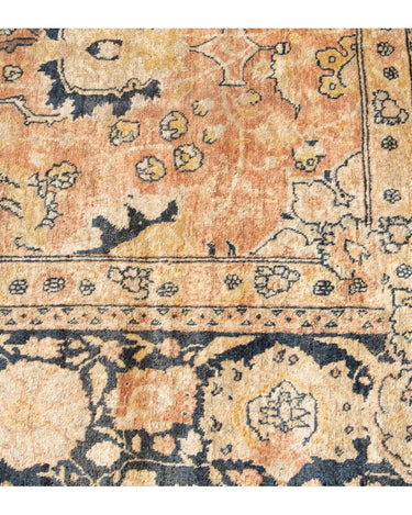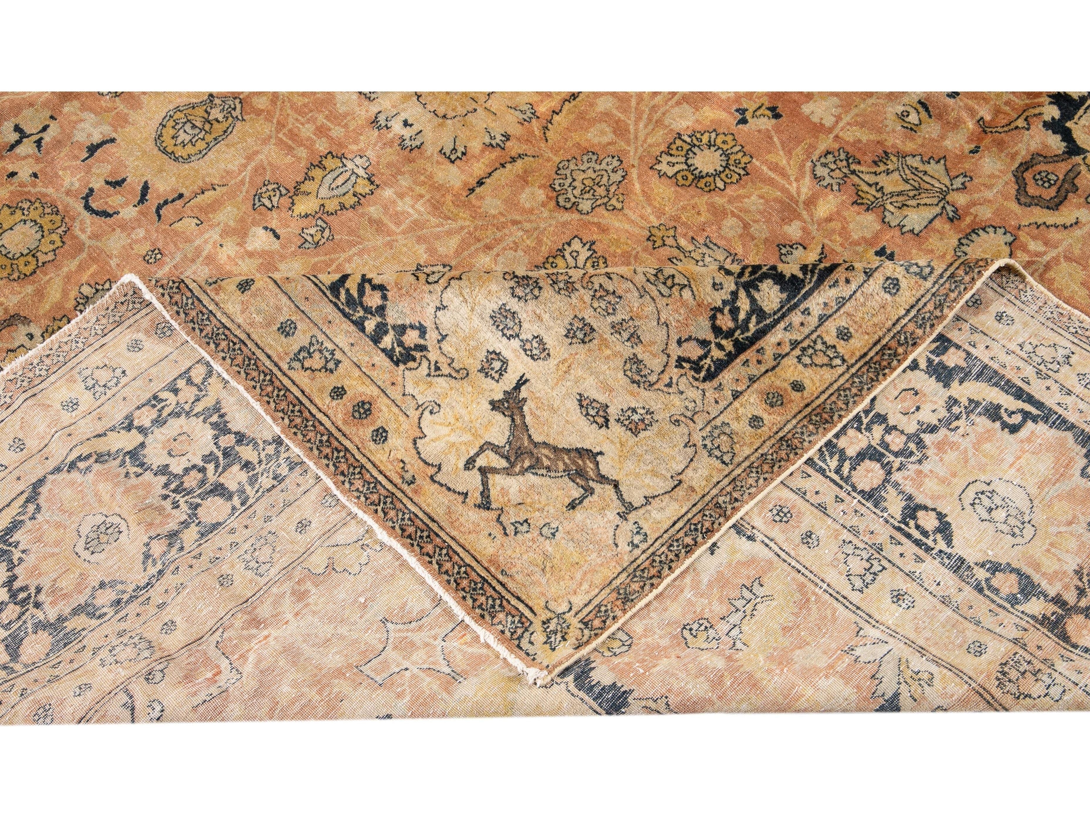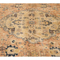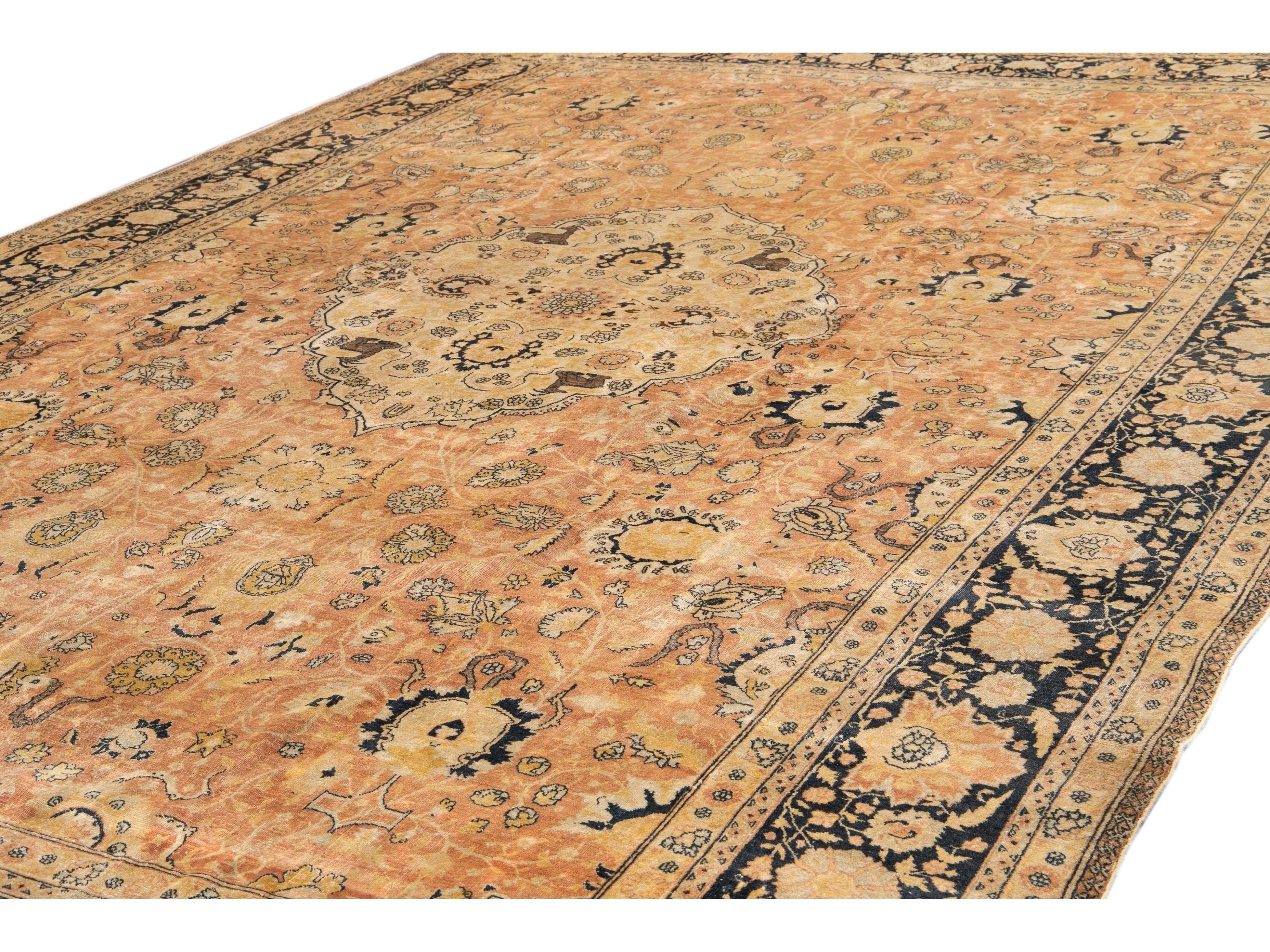 Beautiful antique Agra hand-knotted wool rug with a medallion floral design on a peach field. This Indian rug has accents of brown, blue, and yellow throughout the piece.