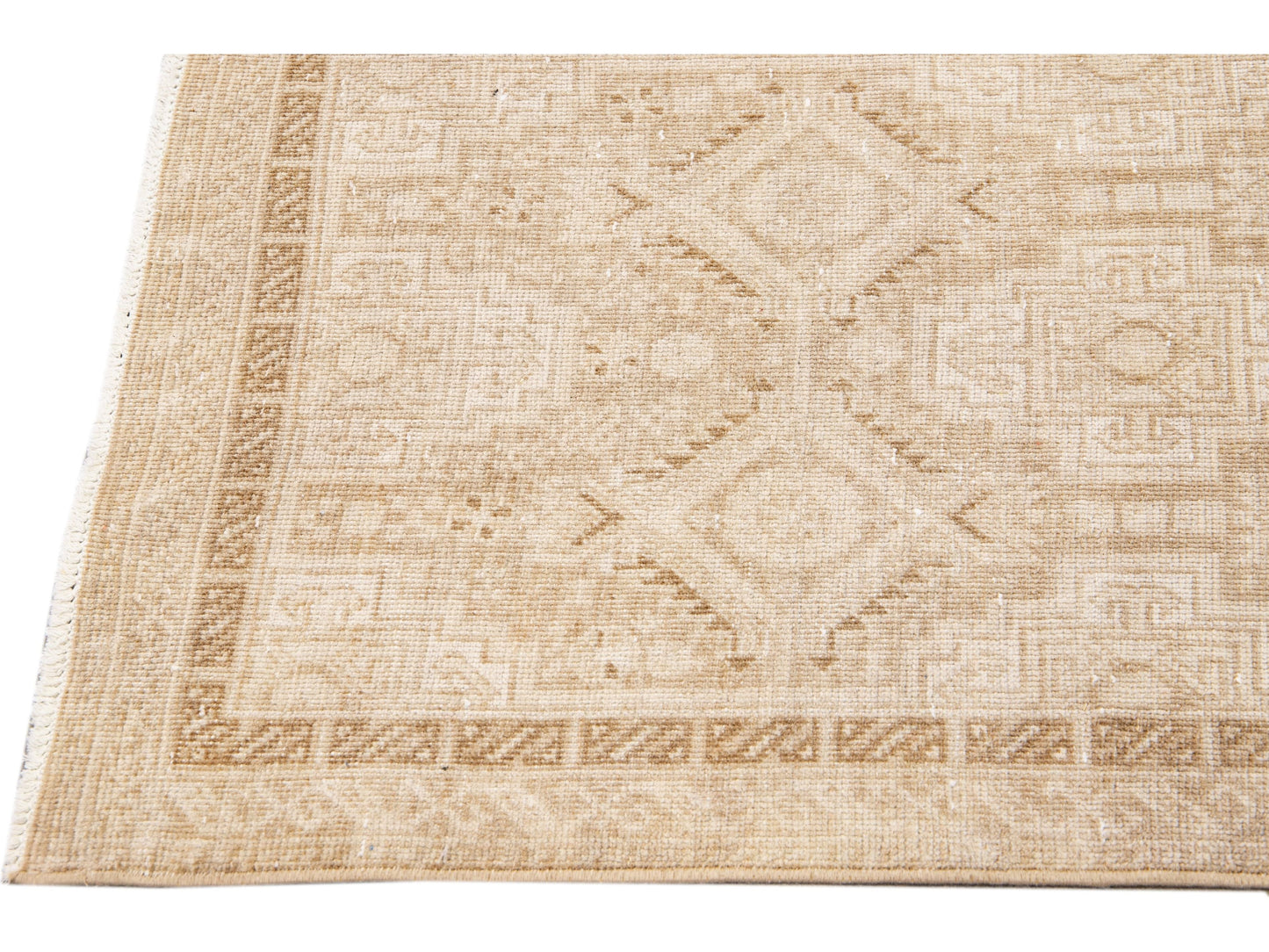 Beautiful antique Turkish Sivas runner rug with a beige field. This piece has an ivory accent in an all-over Tribal design.