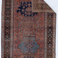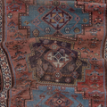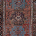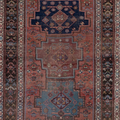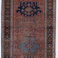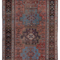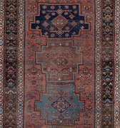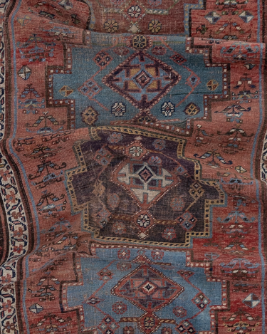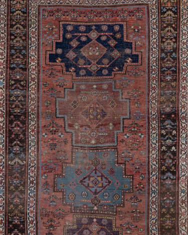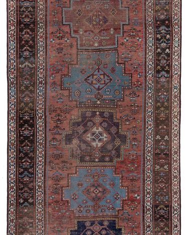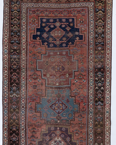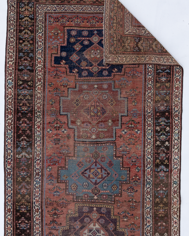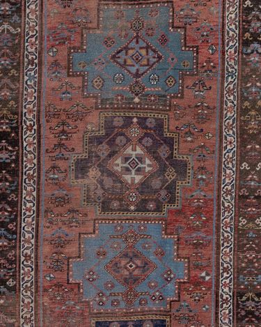Rich and warm with a rustic feel, this early 20th century Kurdish runner features a moody salmon field and lovely blue medallions. There is a gorgeous depth to the colors, design and symbols. A piece like this provides endless study and enjoyment.
